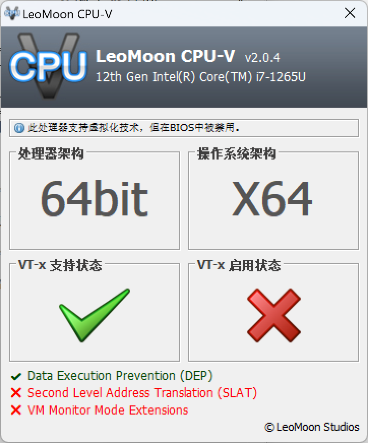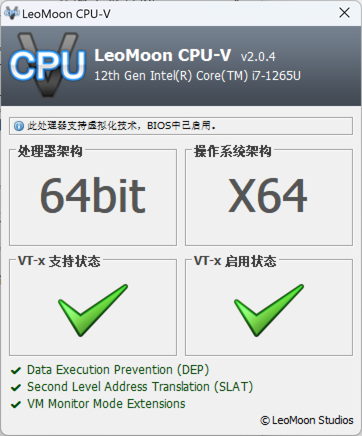 1、下载leomoon cpu-v工具检查,确认本机虚拟化服务可用: