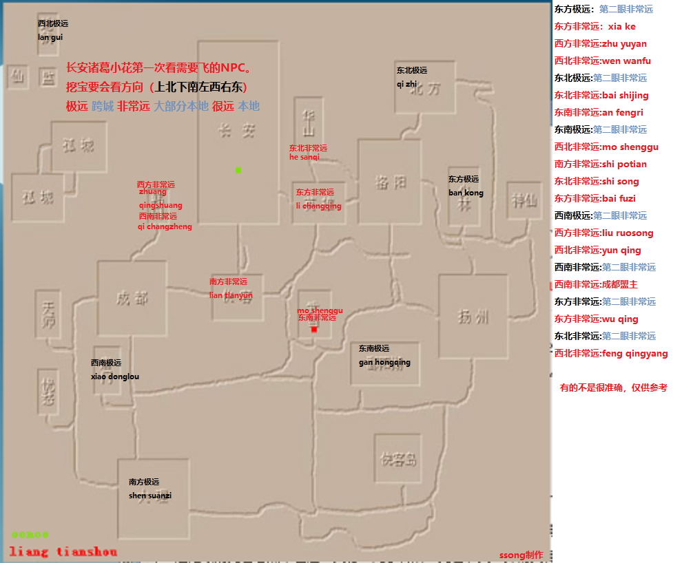 说明:长安接任务后,按照黑体字部分飞对应NPC。然后再dig map,看方位,飞下方普通字体对应NPC。