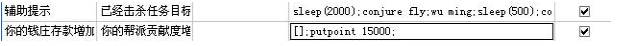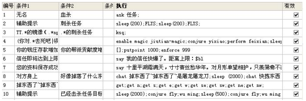 条件 1 辅助提示,条件 2 刺杀任务。执行 sleep(200);FLYS;sleep(200);FLYS;这里 sleep(200)是延迟 200 毫秒执行 FLYS 命令,FLYS 命令是辅助自带的会快速飞到坐标最近的 npc,然后你在根据坐标位置找寻刺杀镜像。防止道心有几率失败可以重复执行 2 次FLYS。偶而会出现镜像消失的情况。可以用 look.sys 来刷新。